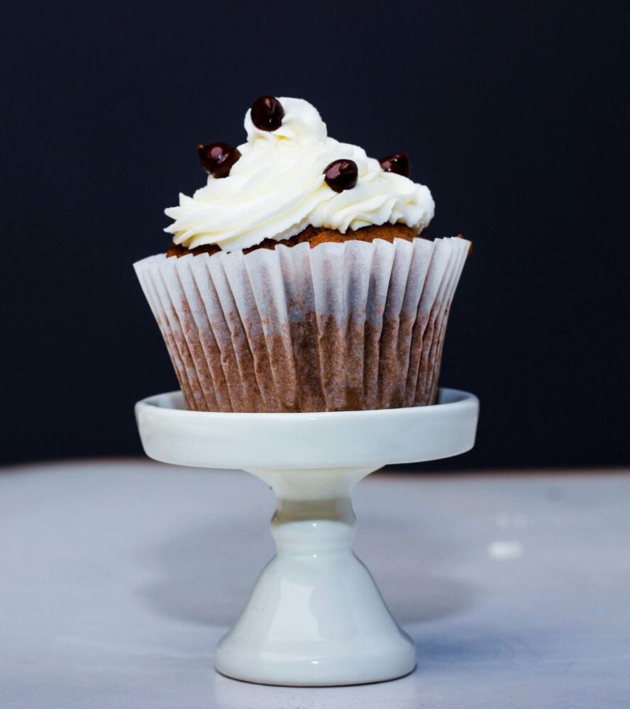 Moist chocolate cupcake frosted with vanilla Swiss meringue buttercream topped with chocolate drops