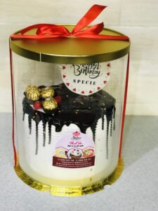 Topped with dark chocolate and Ferrero Rocher, cherries and chocolate drip of your choice ( dark or milk)